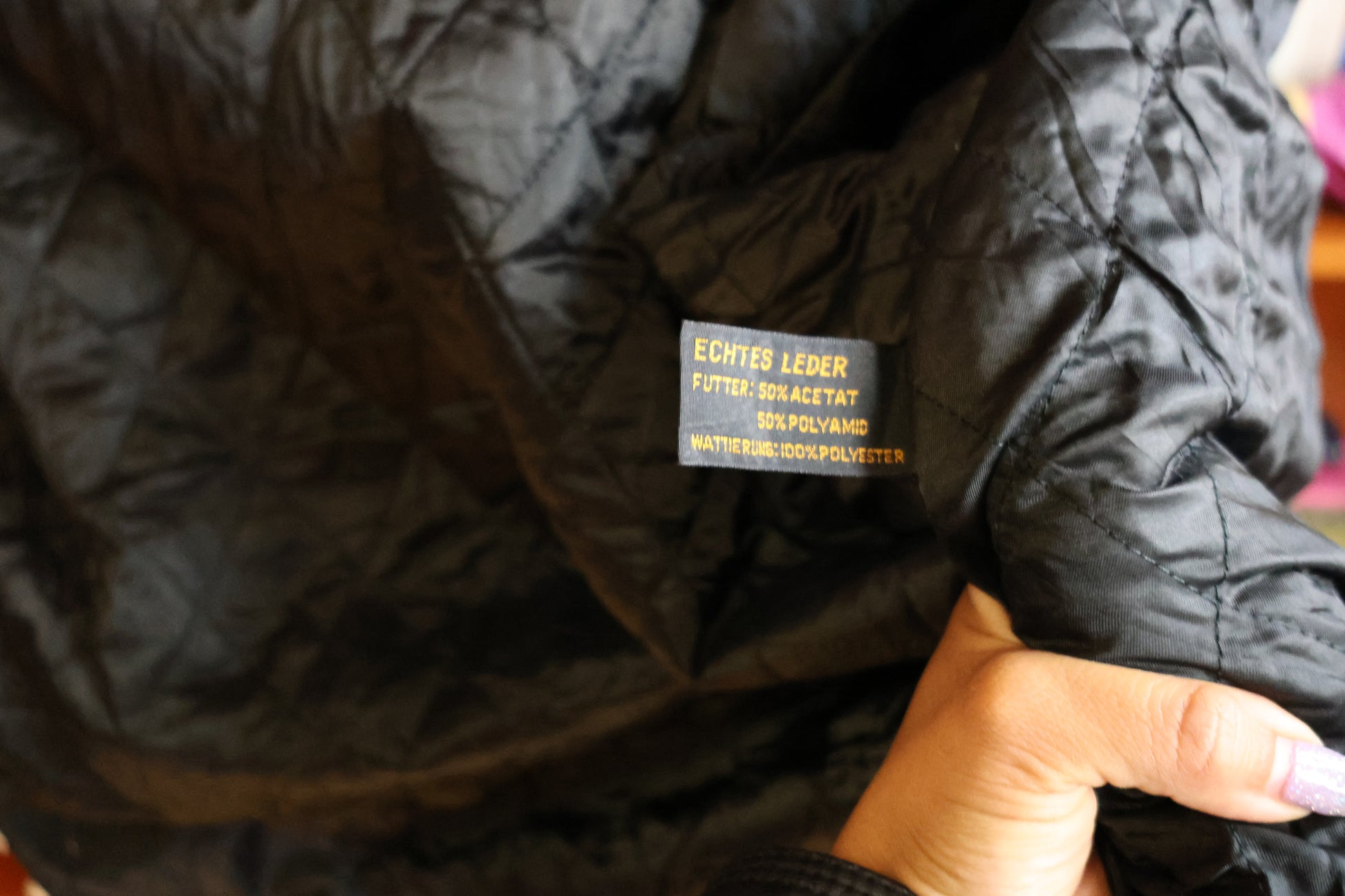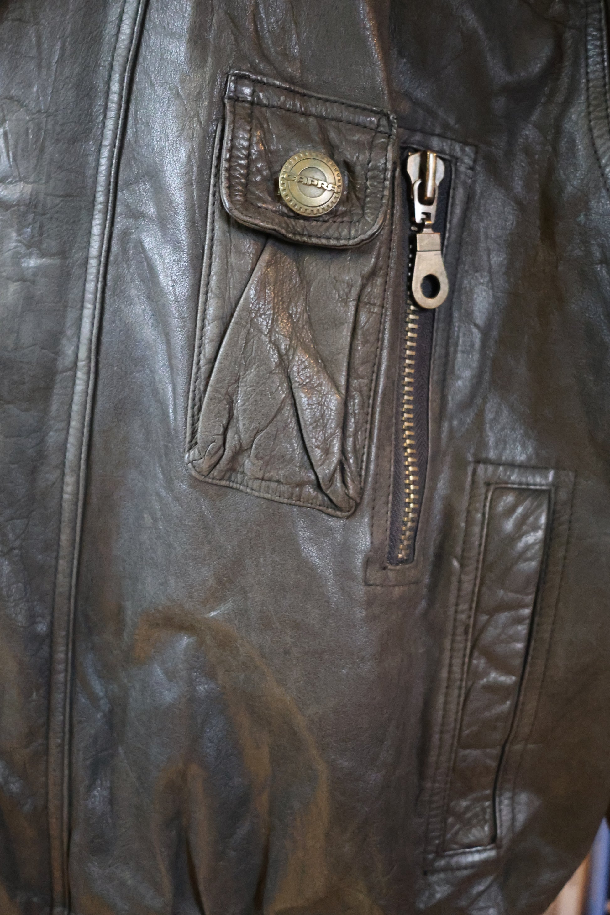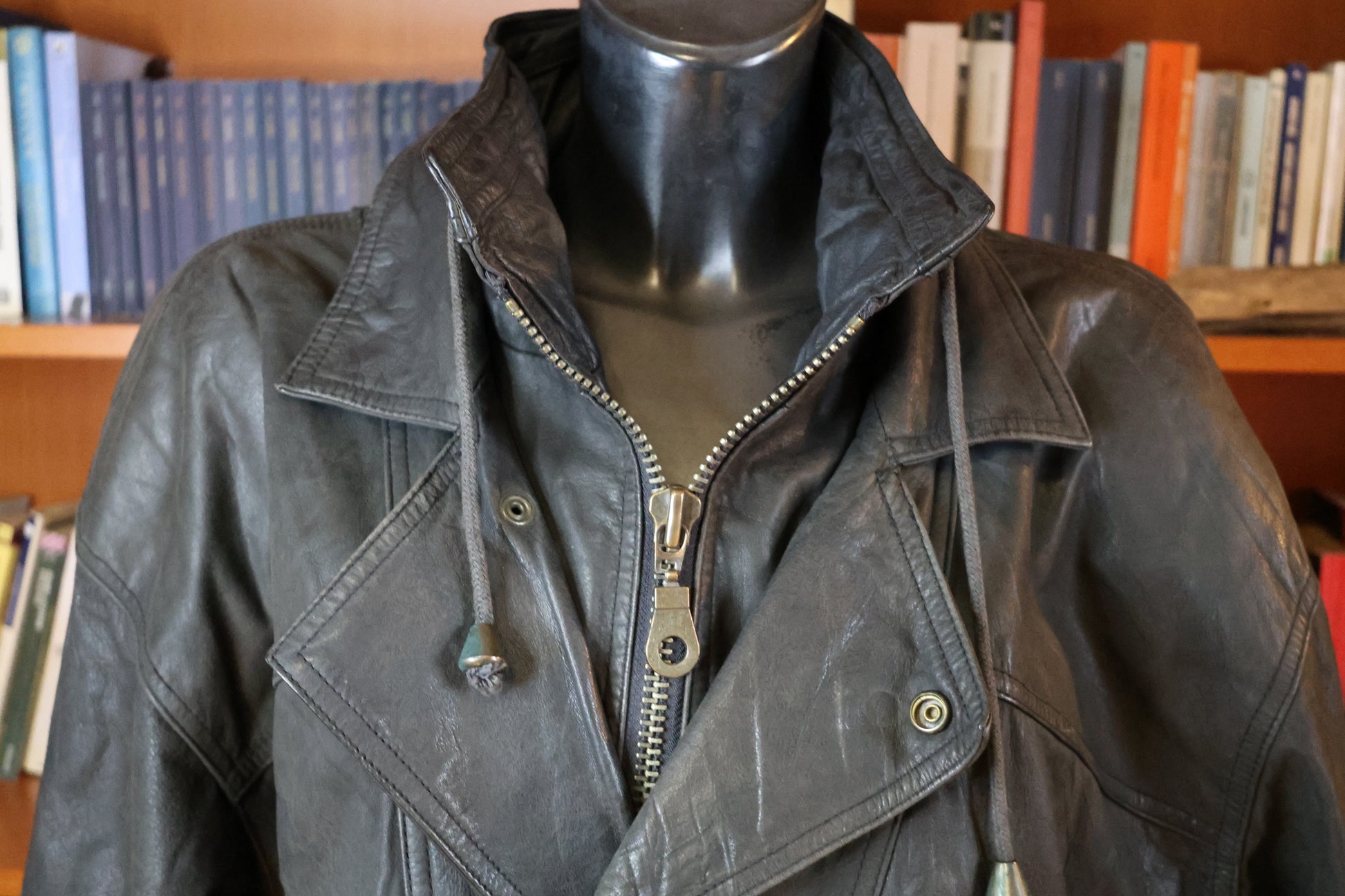 This black leather bomber jacket features a distinctive embroidered CAPRA label. Oversized and cozy, it’s ideal for keeping you warm during chilly evenings. It is maintained in excellent condition.