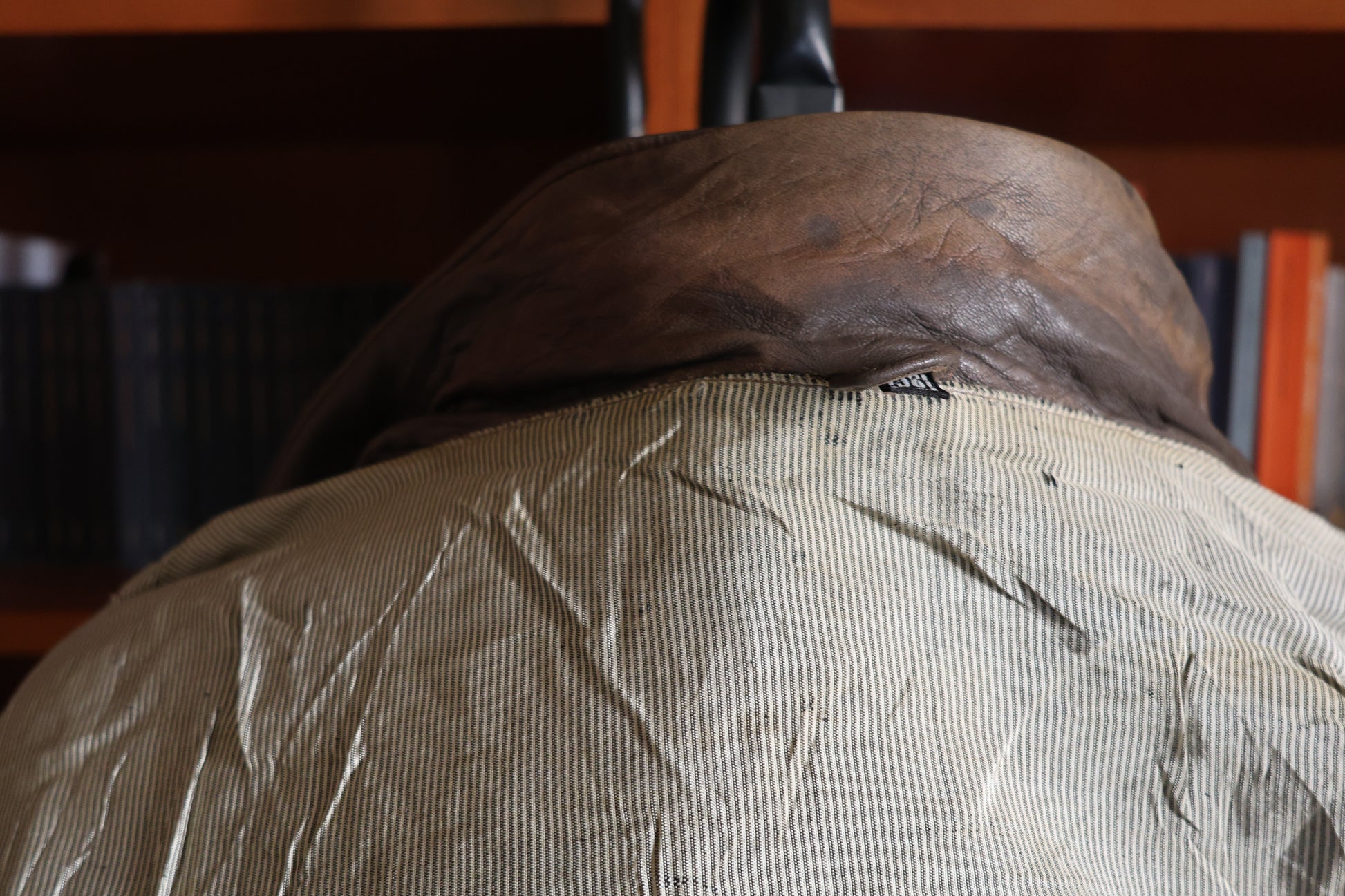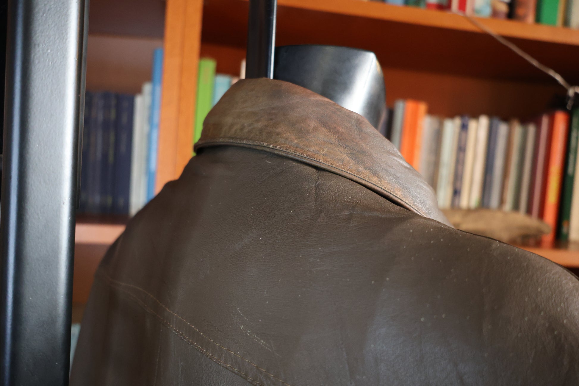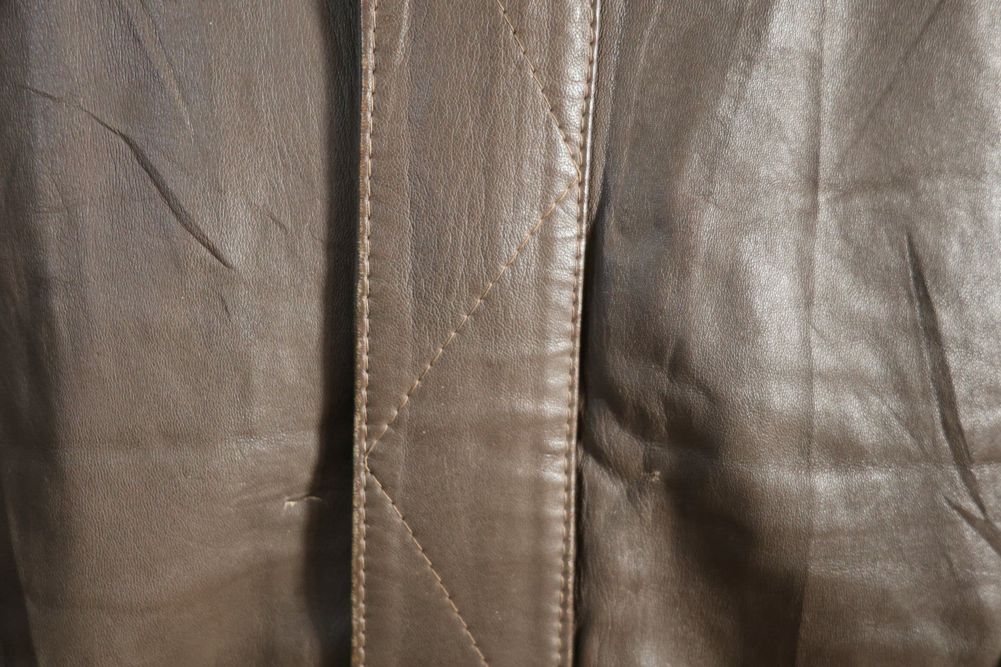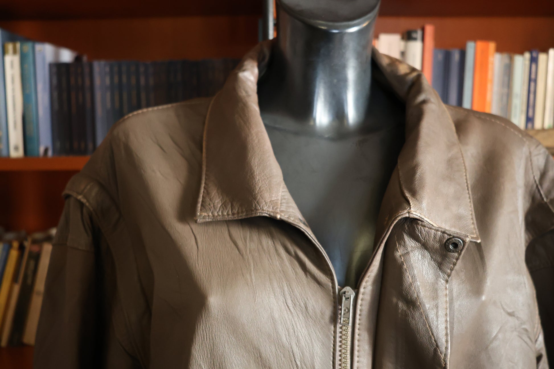 This versatile brown secondhand leather jacket offers two styles in one: wear it with long sleeves or unzip the intern sleeves to transform it into a vest. Its large fit makes it ideal for creating bold, oversized outfits.