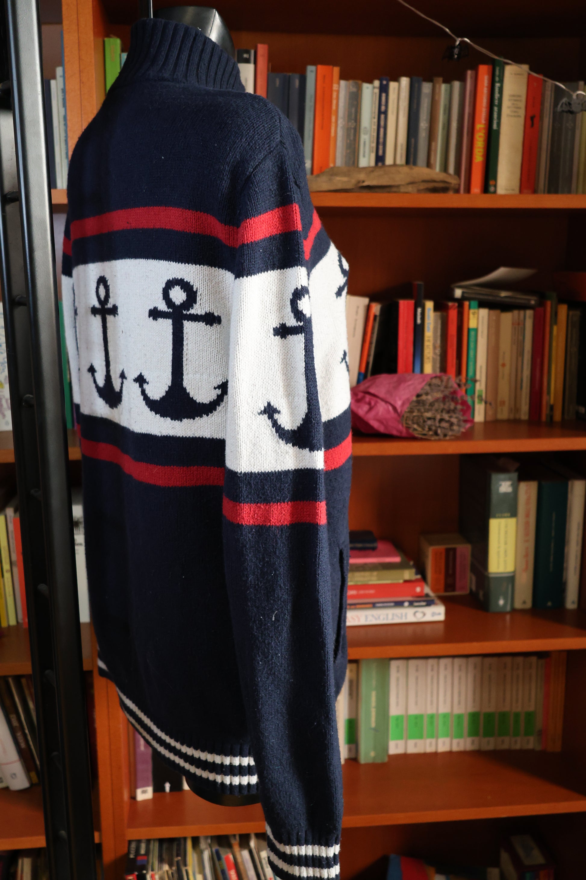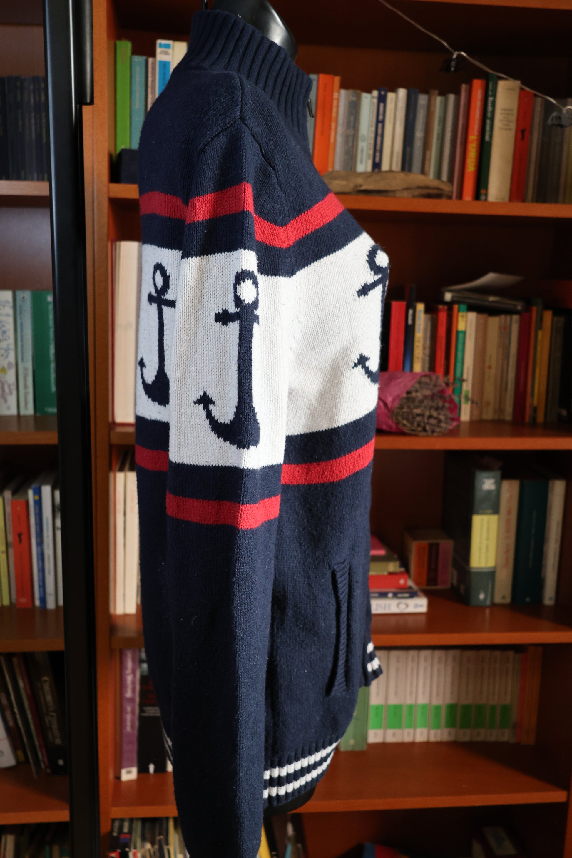 This anchor-themed sweater is ideal for a sailing trip or simply staying cozy. Available in size L and designed for both men and women.
